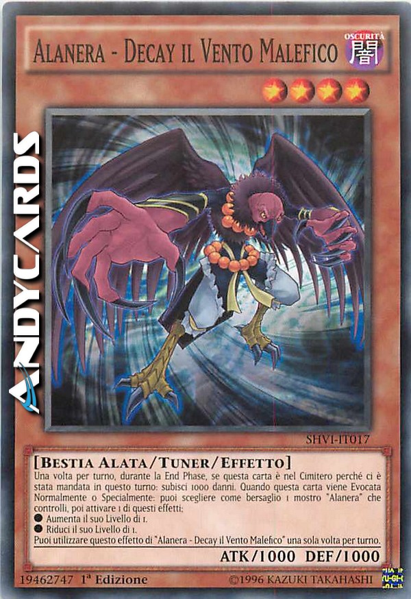 Una volta per turno, durante la End Phase, se questa carta è nel Cimitero perché ci è stata mandata in questo turno: subisci 1000 danni. Quando questa carta viene Evocata Normalmente o Specialmente: puoi scegliere come bersaglio 1 mostro "Alanera" che controlli, poi attivare 1 di questi effetti; - Aumenta il suo Livello di 1. - Riduci il suo Livello di 1. - Puoi utilizzare questo effetto di "Alanera - Decay il Vento Malefico" una sola volta per turno.