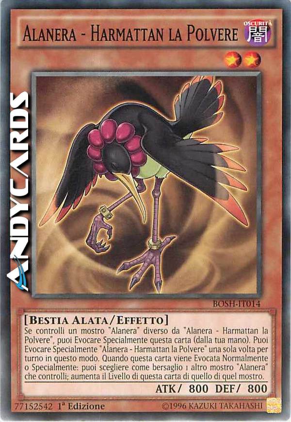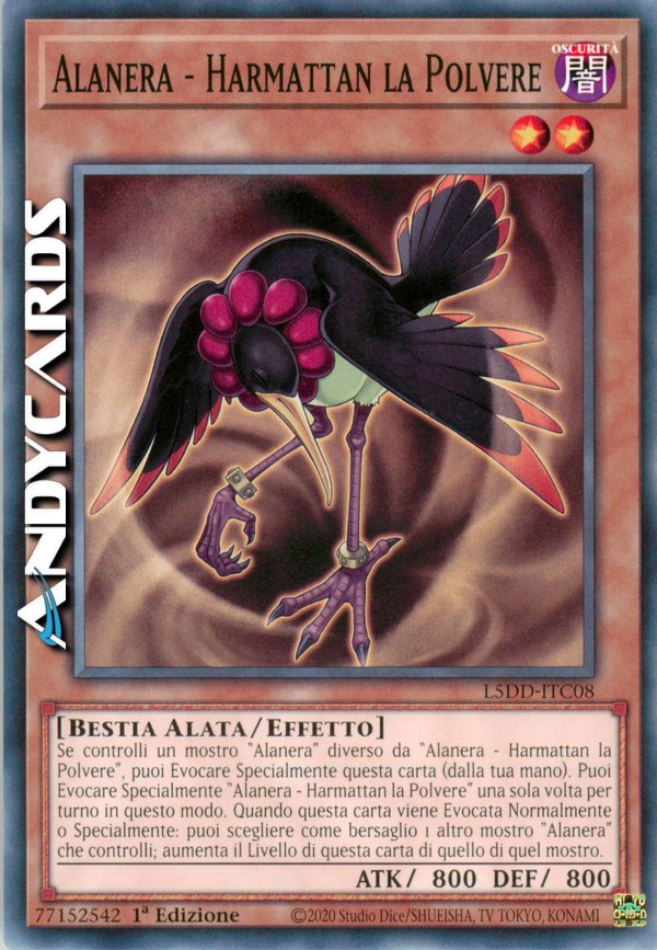 Se controlli un mostro "Alanera" diverso da "Alanera - Harmattan la Polvere", puoi Evocare Specialmente questa carta (dalla tua mano). Puoi Evocare Specialmente "Alanera - Harmattan la Polvere" una sola volta per turno in questo modo. Quando questa carta viene Evocata Normalmente o Specialmente: puoi scegliere come bersaglio 1 altro mostro "Alanera" che controlli; aumenta il Livello di questa carta di quello di quel mostro.