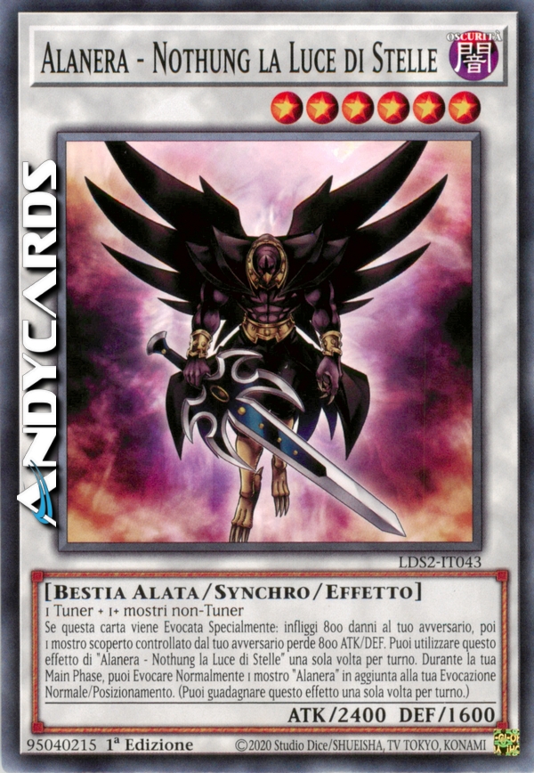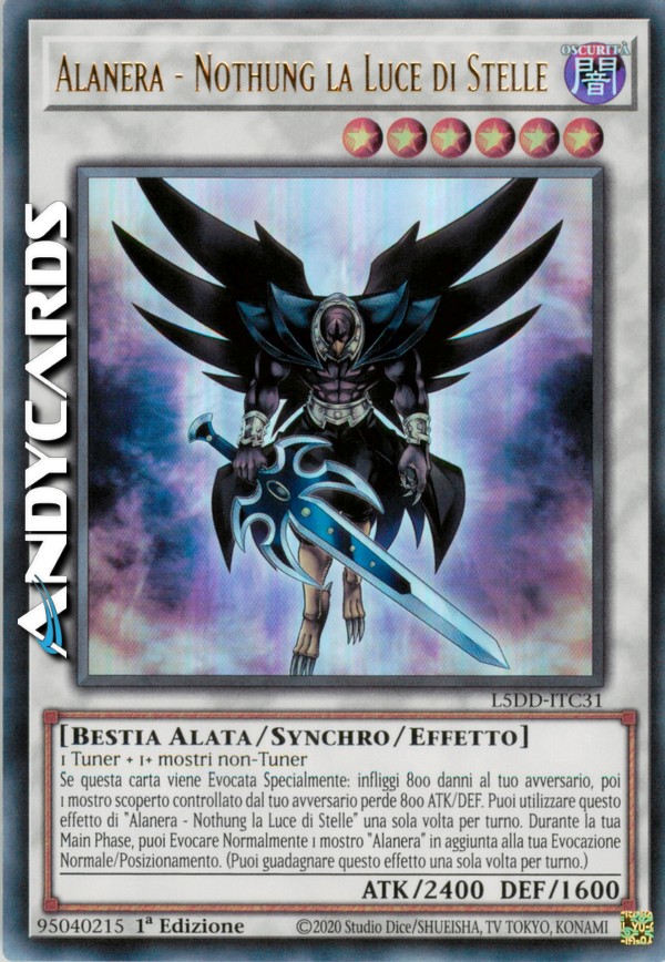 Se questa carta viene Evocata Specialmente: infliggi 800 danni al tuo avversario, poi 1 mostro scoperto controllato dal tuo avversario perde 800 ATK e DEF. Puoi utilizzare questo effetto di "Alanera - Nothung la Luce di Stelle" una sola volta per turno. Durante la tua Main Phase, puoi Evocare Normalmente 1 mostro "Alanera" in aggiunta alla tua Evocazione Normale/Posizionamento. (Puoi guadagnare questo effetto una sola volta per turno.)