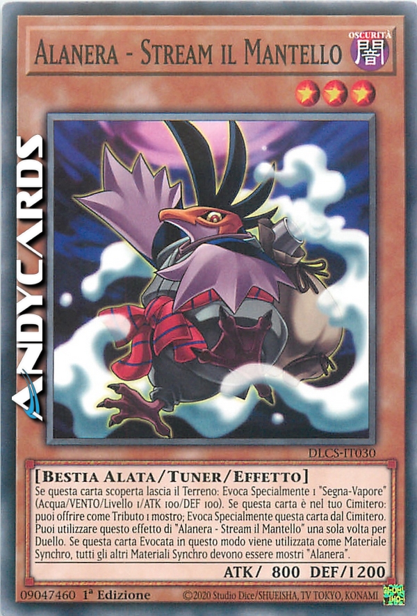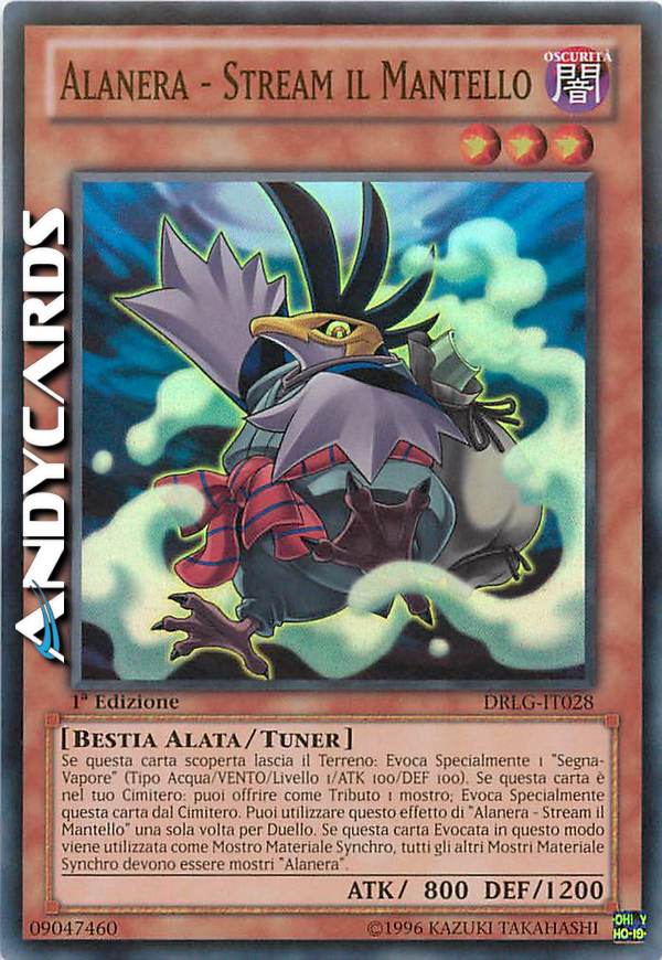 Se questa carta scoperta lascia il Terreno: Evoca Specialmente 1 " Segna-Vapore" (Tipo Acqua/VENTOLivello 1/ATK 100/DEF 100). Se questa carta è nel tuo Cimitero: puoi offrire come Tributo 1 mostro; Evoca Specialmente questa carta dal tuo Cimitero. Puoi utilizzare questo effetto di "Alanera - Stream il Mantello" una sola volta per duello. Se questa carta Evocata in questo modo viene utilizzata come Mostro Materiale Synchro, tutti gli altri Mostri Materiale Synchro devono essere mostri "Alanera".