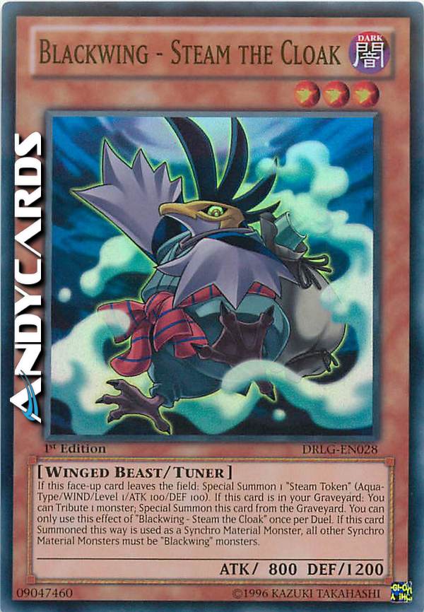 If this face-up card leaves the field: Special Summon 1 "Steam Token" (Aqua-Type/WIND/Level 1/ATK 100/DEF 100). If this card is in your Graveyard: You can Tribute 1 monster; Special Summon this card from the Graveyard. You can only use this effect of "Blackwing - Steam the Cloak" once per Duel. If this card Summoned this way is used as a Synchro Material Monster, all other Synchro Material Monsters must be "Blackwing" monsters.
