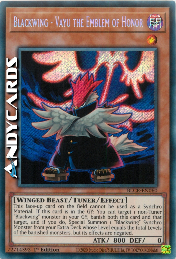 This face-up card on the field cannot be used as a Synchro Material. If this card is in the GY: You can target 1 non-Tuner "Blackwing" monster in your GY; banish both this card and that target, and if you do, Special Summon 1 "Blackwing" Synchro Monster from your Extra Deck whose Level equals the total Levels of the banished monsters, but its effects are negated.