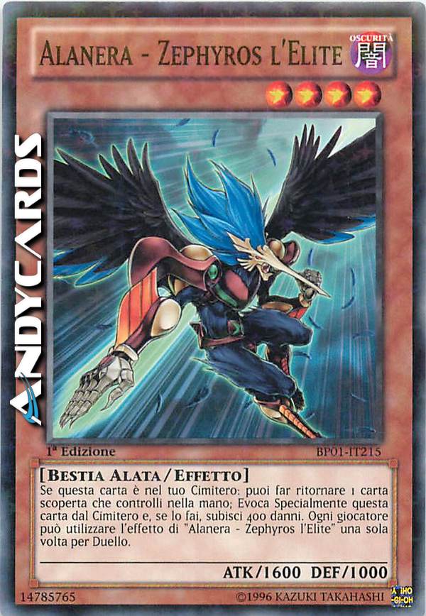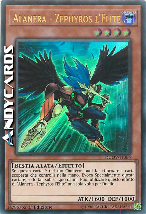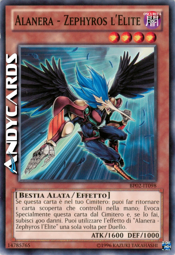 Se questa carta è nel tuo Cimitero: puoi far ritornare 1 carta scoperta che controlli nella mano; Evoca Specialmente questa carta e, se lo fai, subisci 400 danni. Puoi utilizzare questo effetto di "Alanera - Zephyros l'Elite" una sola volta per Duello.