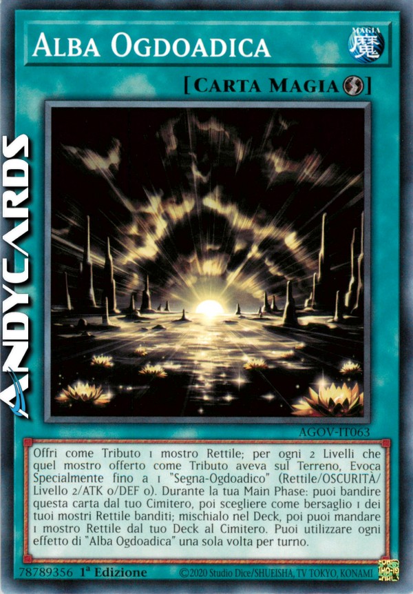 Offri come Tributo 1 mostro Rettile; per ogni 2 Livelli che quel mostro offerto come Tributo aveva sul Terreno, Evoca Specialmente fino a 1 "Segna-Ogdoadico" (Rettile/OSCURITÀ/Livello 2/ATK 0/DEF 0). Durante la tua Main Phase: puoi bandire questa carta dal tuo Cimitero, poi scegliere come bersaglio 1 dei tuoi mostri Rettile banditi; mischialo nel Deck, poi puoi mandare 1 mostro Rettile dal tuo Deck al Cimitero. Puoi utilizzare ogni effetto di "Alba Ogdoadica" una sola volta per turno.