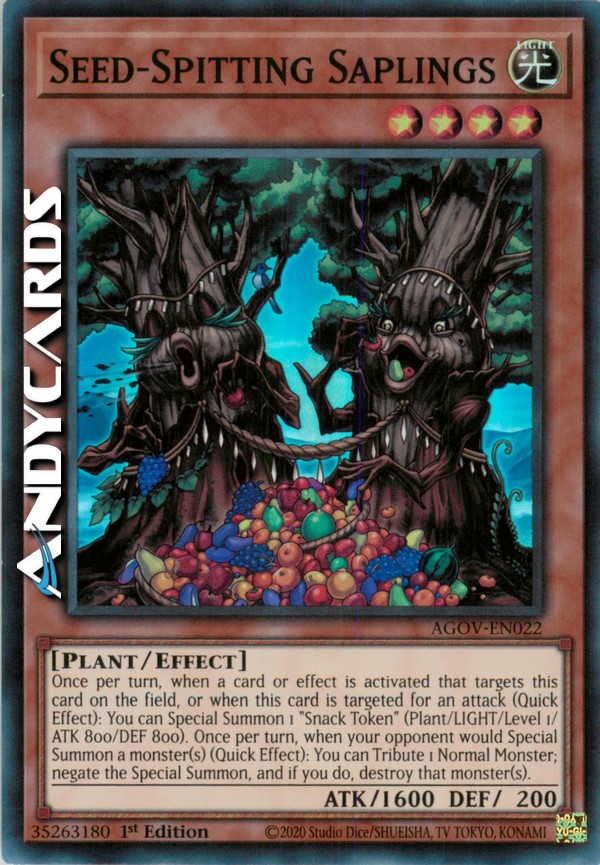 Once per turn, when a card or effect is activated that targets this card on the field, or when this card is targeted for an attack (Quick Effect): You can Special Summon 1 "Snack Token" (Plant/LIGHT/Level 1/ATK 800/DEF 800). Once per turn, when your opponent would Special Summon a monster(s) (Quick Effect): You can Tribute 1 Normal Monster; negate the Special Summon, and if you do, destroy that monster(s).