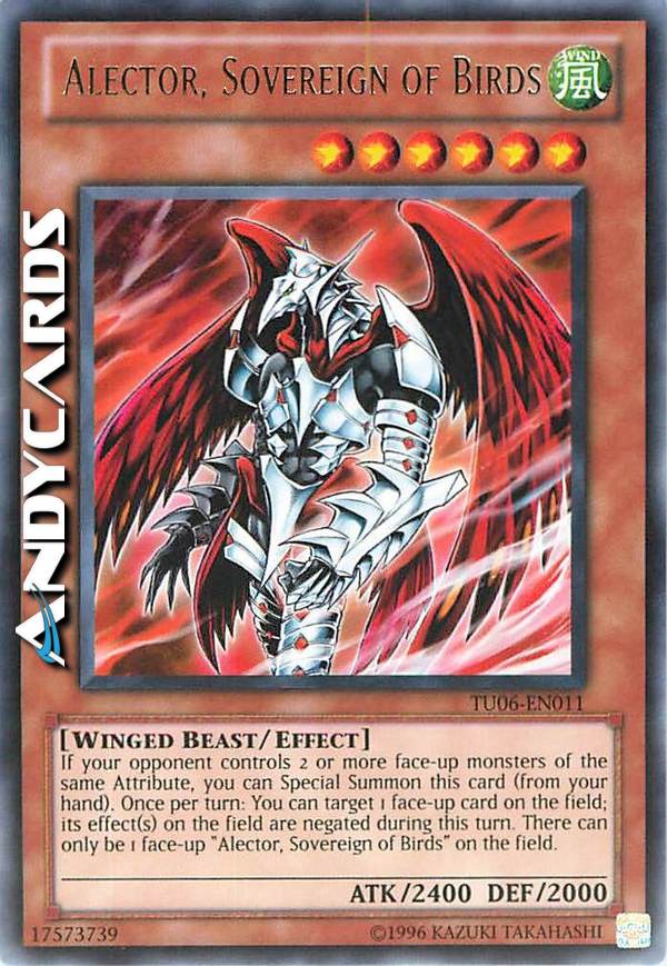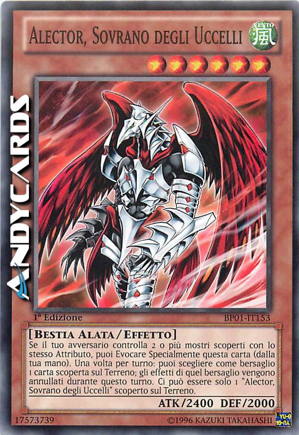 Se il tuo avversario controlla 2 o più mostri scoperti con lo stesso Attributo, puoi Evocare Specialmente questa carta (dalla tua mano). Una volta per turno: puoi scegliere come bersaglio 1 carta scoperta sul Terreno; gli effetti di quel bersaglio vengono annullati durante questo turno. Ci può essere solo 1 "Alector, Sovrano degli Uccelli" scoperto sul Terreno.