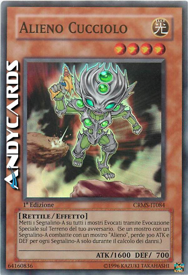 Metti 1 "segnalino-A"su tutti i mostri evocati tramite eocazione speciale sul terreno del tuo avversario.(Se un mostro con un"segnalino-A"combatte con un mostro "alieno",perde 300 ATK e DEF per ogni "segnalino-A"solo durante il calcolo dei danni.)
