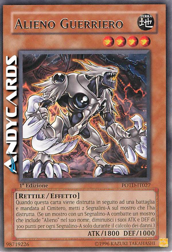 Quando questa carta viene distrutta in seguito ad una battaglia e mandata al Cimitero, metti 2 Segnalini-A sul mostro che l'ha distrutta. (Se un mostro con un Segnalino-A combatte un mostro che include "Alieno" nel suo nome, diminuisci i suoi ATK e DEF di 300 punti per ogni Segnalino-A solo durante il calcolo dei danni.)