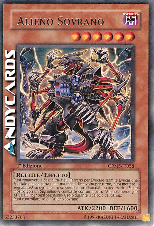 Puoi rimuovere 2 "segnalini-A"sul terreno per evocare tramite evocazione specilae quesa carta dalla tua mano.Una volta per turno puoi mettere 1 "segnalino-A"su ogni mostro scoperto controllato dal tuo avversario.(Se un mostro con un"segnalino-A"combatte con un mostro "alieno",perde 300 ATK e DEF per ogni "segnalino-A"solo durante il calcolo dei danni.)Puoi controllare solo 1 "alieno sovrano".