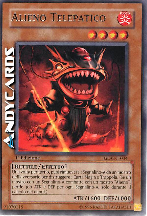 Una volta per turno, puoi rimuovere 1 Segnalino-A da un mostro dell'avversario per distruggere 1 Carta Magia o Trappola. (Se un mostro con un Segnalino-A combatte un mostro che include "Alieno" nel suo nome, diminuisci i suoi ATK e DEF di 300 punti per ogni Segnalino-A solo durante il calcolo dei danni.)