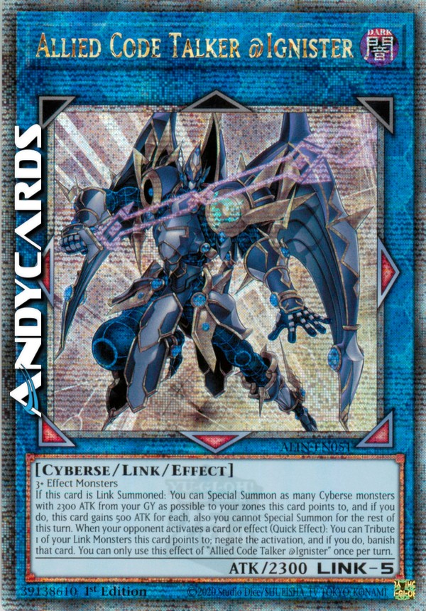 If this card is Link Summoned: You can Special Summon as many Cyberse monsters with 2300 ATK from your GY as possible to your zones this card points to, and if you do, this card gains 500 ATK for each, also you cannot Special Summon for the rest of this turn. When your opponent activates a card or effect (Quick Effect): You can Tribute 1 of your Link Monsters this card points to; negate the activation, and if you do, banish that card. You can only use this effect of "Allied Code Talker @Ignister" once per turn.