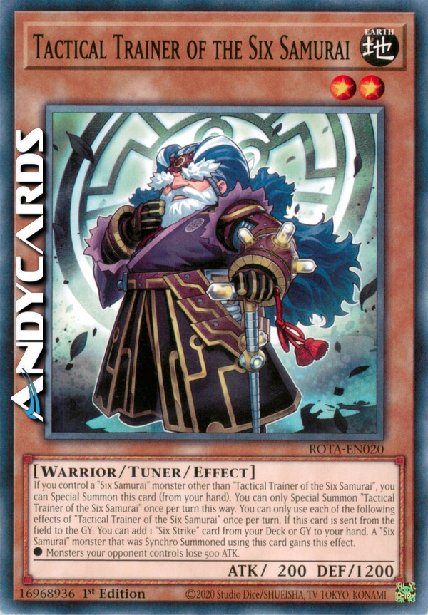 If you control a "Six Samurai" monster other than "Tactical Trainer of the Six Samurai", you can Special Summon this card (from your hand). You can only Special Summon "Tactical Trainer of the Six Samurai" once per turn this way. You can only use each of the following effects of "Tactical Trainer of the Six Samurai" once per turn. If this card is sent from the field to the GY: You can add 1 "Six Strike" card from your Deck or GY to your hand. A "Six Samurai" monster that was Synchro Summoned using this card gains this effect.