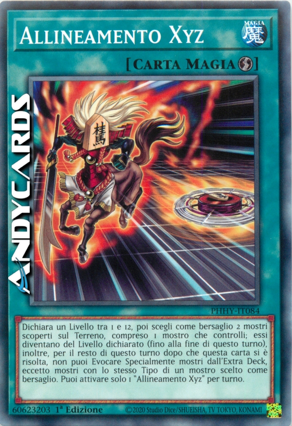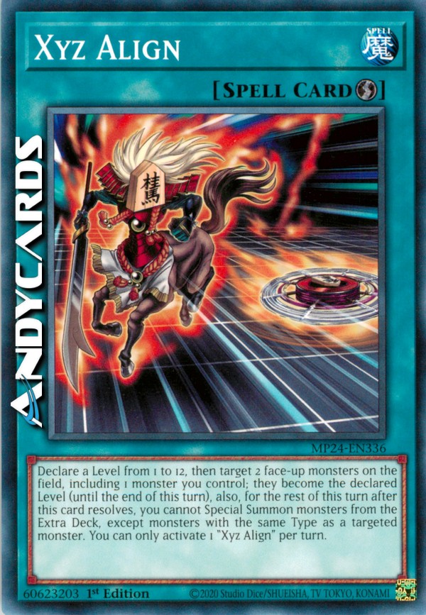 Dichiara un Livello tra 1 e 12, poi scegli come bersaglio 2 mostri scoperti sul Terreno, compreso 1 mostro che controlli; essi diventano del Livello dichiarato (fino alla fine di questo turno), inoltre, per il resto di questo turno dopo che questa carta si è risolta, non puoi Evocare Specialmente mostri dall'Extra Deck, eccetto mostri con lo stesso Tipo di un mostro scelto come bersaglio. Puoi attivare solo 1 "Allineamento Xyz" per turno.