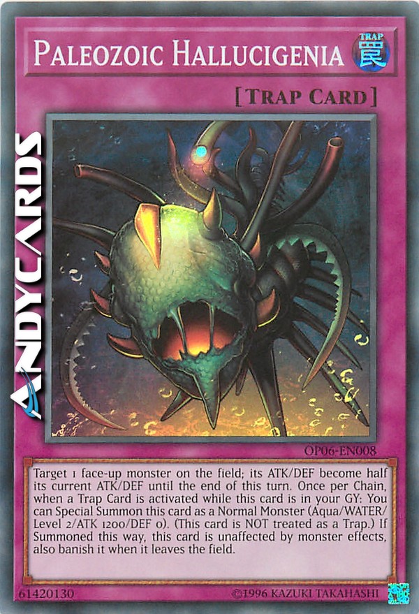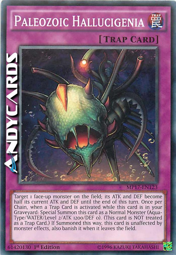 Target 1 face-up monster on the field; its ATK and DEF become half its current ATK and DEF until the end of this turn. Once per Chain, when a Trap Card is activated while this card is in your Graveyard: Special Summon this card as a Normal Monster(Aqua/WATER/Level 2/ATK 1200/DEF 0). (This card is NOT treated as a Trap Card.) If Summoned this way, this card is unaffected by monster effects, also banish it when it leaves the field.