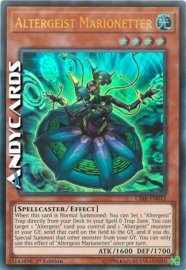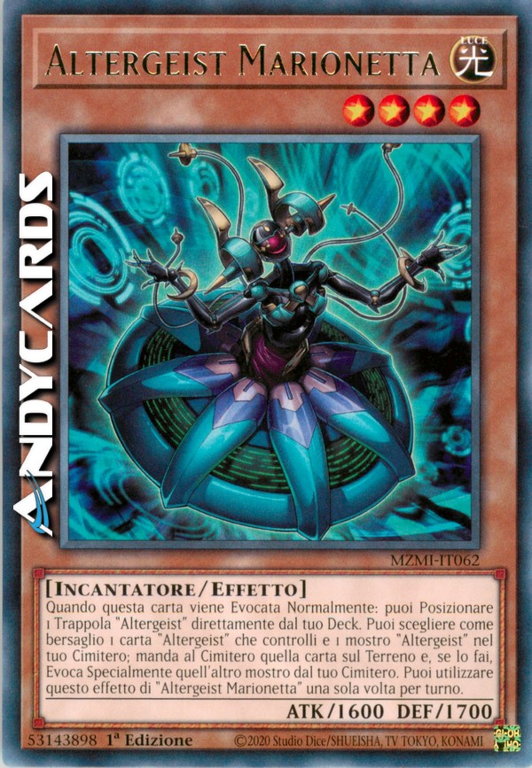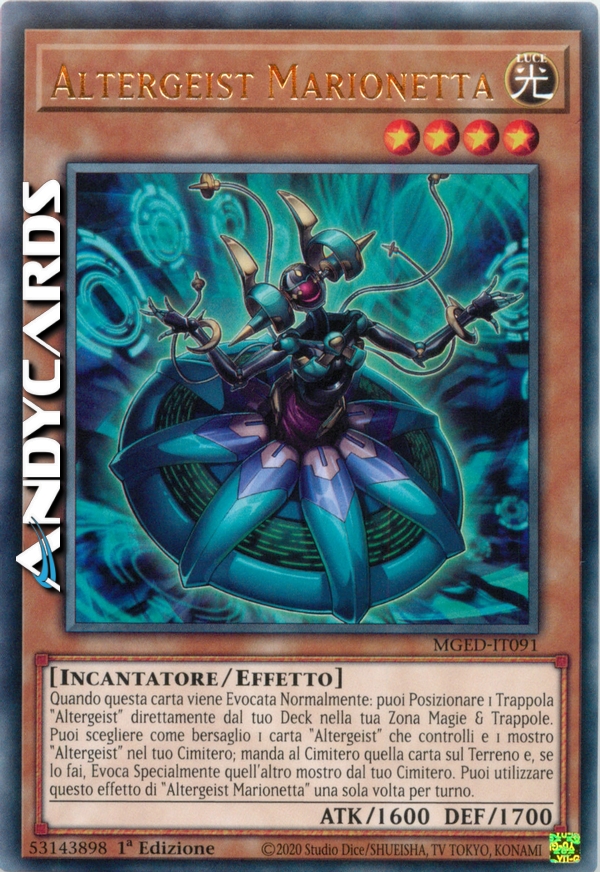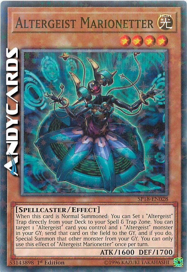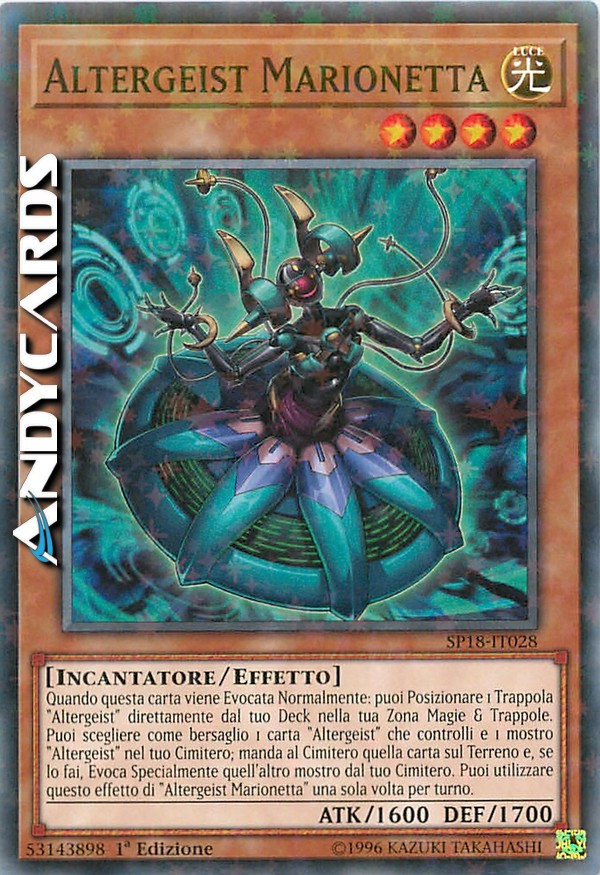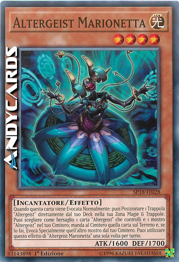 Quando questa carta viene Evocata Normalmente: puoi Posizionare 1 Trappola "Altergeist" direttamente dal tuo Deck nella tua Zona Magie & Trappole. Puoi scegliere come bersaglio 1 carta "Altergeist" che controlli e 1 mostro "Altergeist" nel tuo Cimitero; manda al Cimitero quella carta sul Terreno e, se lo fai, Evoca Specialmente quell'altro mostro dal tuo Cimitero. Puoi utilizzare questo effetto di "Altergeist Marionetta" una sola volta per turno.