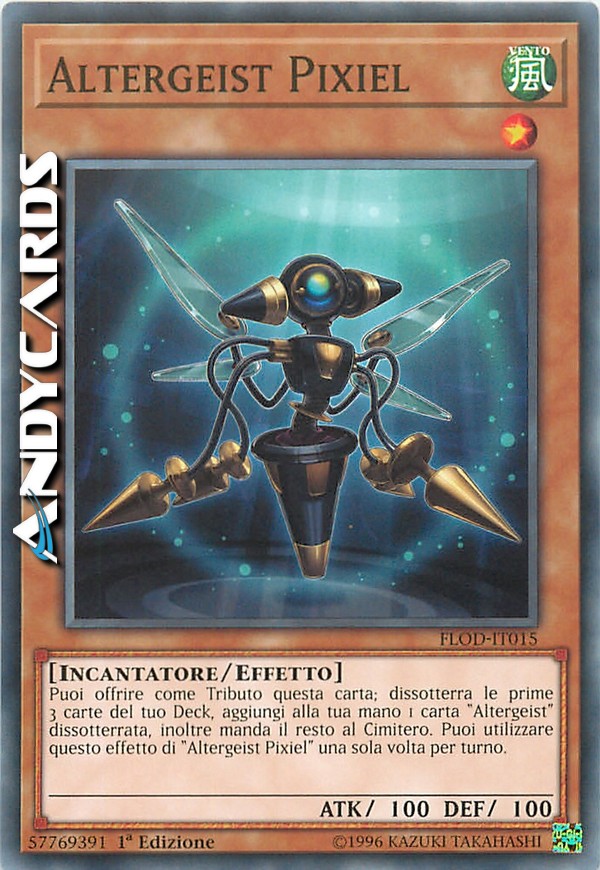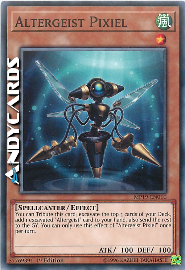 Puoi offrire come Tributo questa carta; dissotterra le prime 3 carte del tuo Deck, aggiungi alla tua mano 1 carta "Altergeist" dissotterrata, inoltre manda il resto al Cimitero. Puoi utilizzare questo effetto di "Altergeist Pixiel" una sola volta per turno.