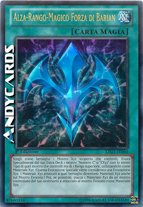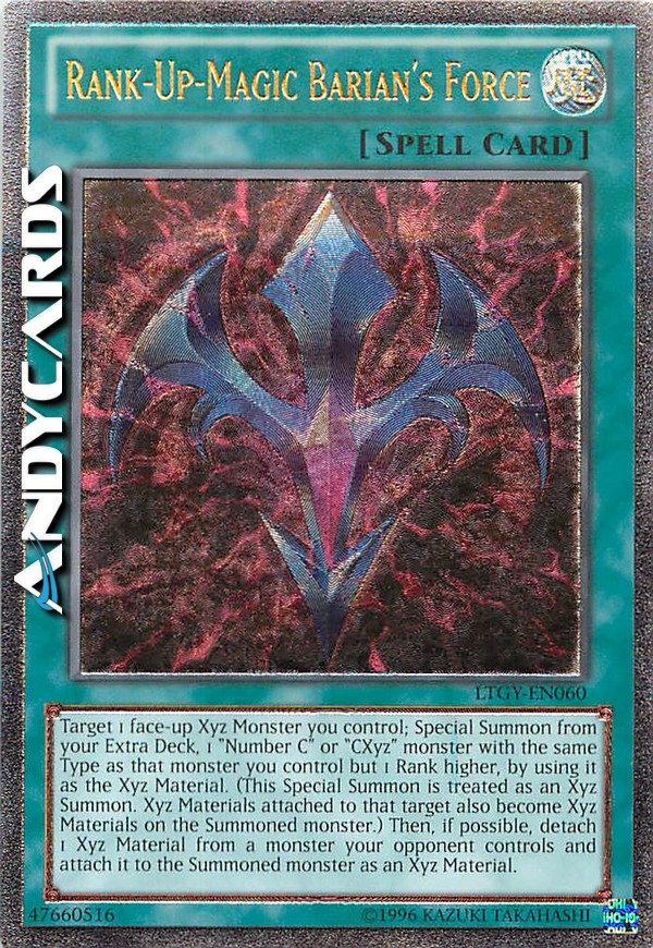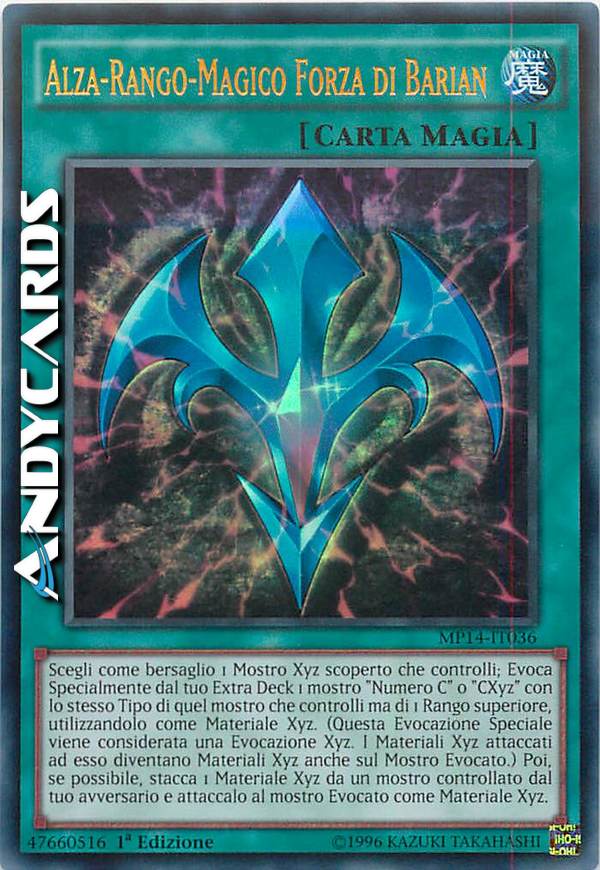 Segli come bersaglio 1 Mostro Xyz scoperto che controlli; Evoca Specialmente dal tuo Extra Deck 1 mostro "Numero C" o "CXyz" con lo stesso Tipo di quel mostro che controlli ma di 1 Rango superiore, utilizzandolo come Materiale Xyz. (Questa Evocazione Speciale viene considerata una Evocazione Xyz. I Materiali Xyz attaccati a quel mostro diventano Materiali Xyz anche sul Mostro Evocato.) Poi, se possibile, stacca 1 Materiale Xyz da un mostro controllato dal tuo avversario e attaccalo al mostro Evocato come Materiale Xyz.