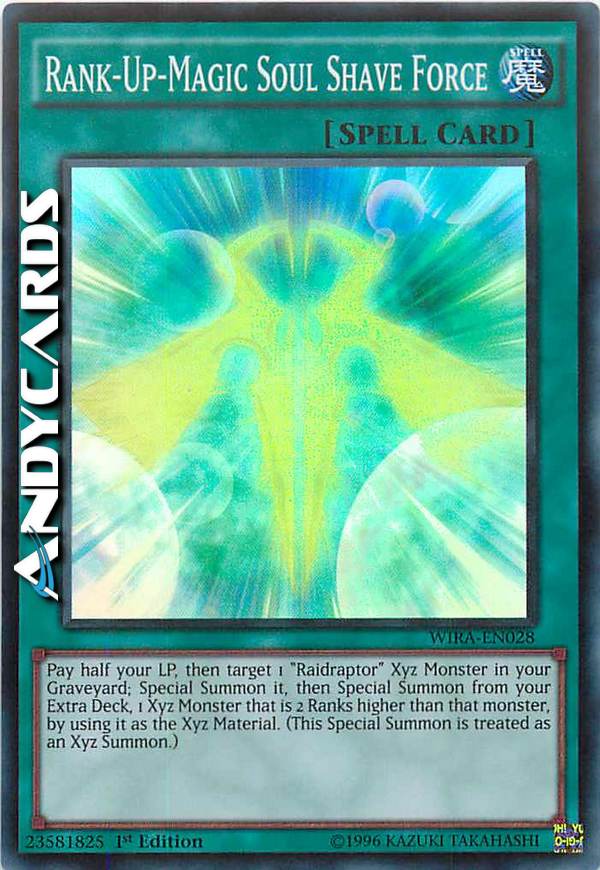 Paga la metà dei tuoi LP, poi scegli come bersaglio 1 Mostro Xyz "Raidraptor" nel tuo Cimitero; Evocalo Specialmente, poi Evoca Specialmente dal tuo Extra Deck 1 Mostro Xyz che è di 2 Ranghi superiore a quel mostro, utilizzandolo come Materiale Xyz. (Questa Evocazione Speciale viene considerata un'Evocazione Xyz.)
