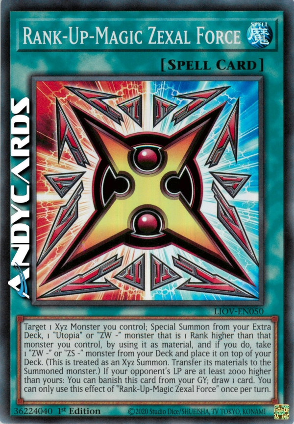 Scegli come bersaglio 1 Mostro Xyz che controlli; Evoca Specialmente dal tuo Extra Deck, 1 mostro "Utopia" o "ZW -" che è di 1 Rango superiore a quel mostro che controlli, utilizzandolo come materiale, e, se lo fai, prendi 1 mostro "ZW -" o "ZS -" dal tuo Deck e mettilo in cima al tuo Deck. (Questa viene considerata come un'Evocazione Xyz. Trasferisci i suoi materiali sul mostro Evocato.) Se i LP del tuo avversario sono almeno di 2000 superiori ai tuoi: puoi bandire questa carta dal tuo Cimitero; pesca 1 carta. Puoi utilizzare questo effetto di "Alza-Rango-Magico Forza Zexal" una sola volta per turno.