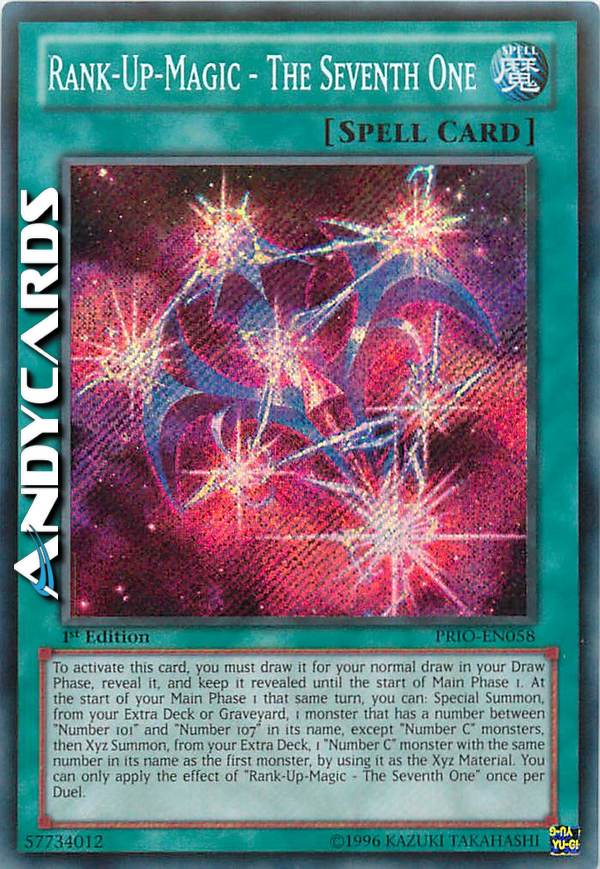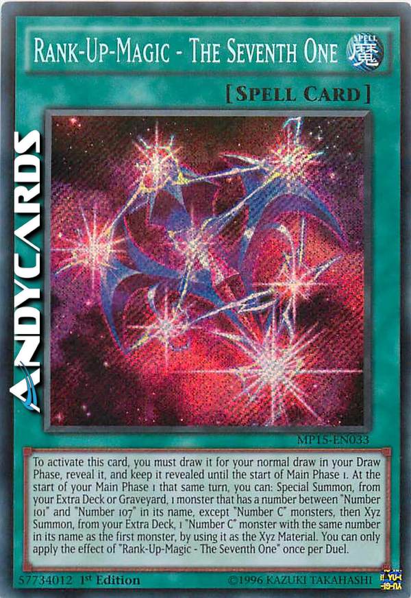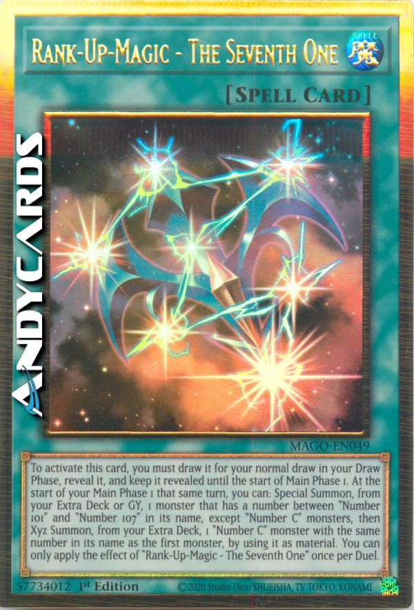 To activate this card, you must draw it for your normal draw in your Draw Phase, reveal it, and keep it revealed until the start of Main Phase 1. At the start of your Main Phase 1 that same turn, you can: Special Summon, from your Extra Deck or GY, 1 monster that has a number between "Number 101" and "Number 107" in its name, except "Number C" monsters, then Xyz Summon, from your Extra Deck, 1 "Number C" monster with the same number in its name as the first monster, by using it as material. You can only apply the effect of "Rank-Up-Magic - The Seventh One" once per Duel.