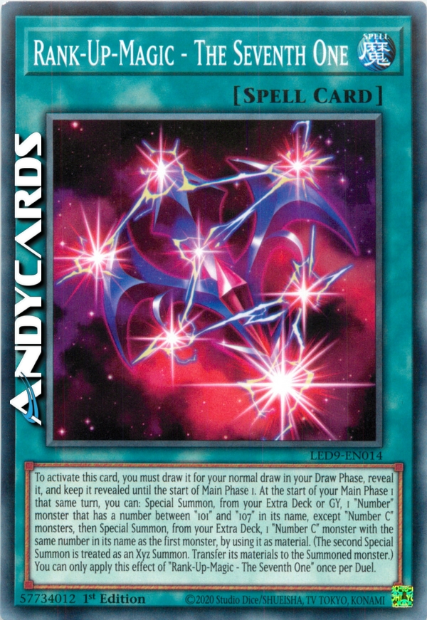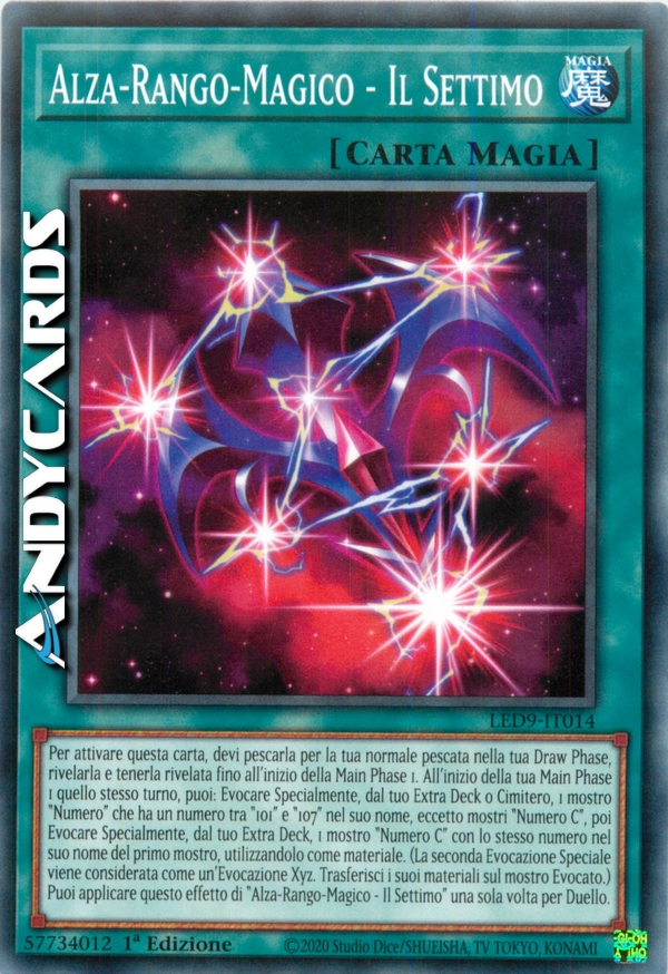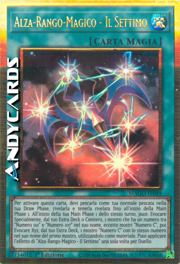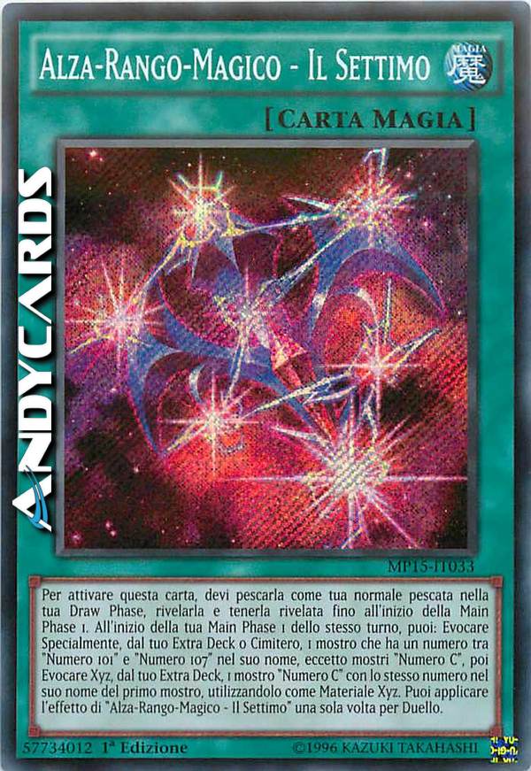 Per attivare questa carta, devi pescarla come tua normale pescata nella tua Draw Phase, rivelarla e tenerla rivelata fino all'inizio della Main Phase 1. All'inizio della tua Main Phase 1 quello stesso turno, puoi: Evocare Specialmente, dal tuo Extra Deck o Cimitero, 1 mostro che ha un numero tra "Numero 101" e "Numero 107" nel suo nome, eccetto mostri "Numero C", poi Evocare Xyz, dal tuo Extra Deck, 1 mostro "Numero C" con lo stesso numero nel suo nome del primo mostro, utilizzandolo come materiale. Puoi applicare l'effetto di "Alza-Rango-Magico - Il Settimo" una sola volta per Duello.