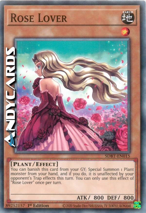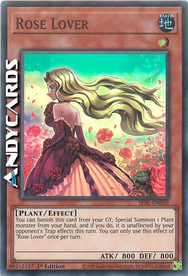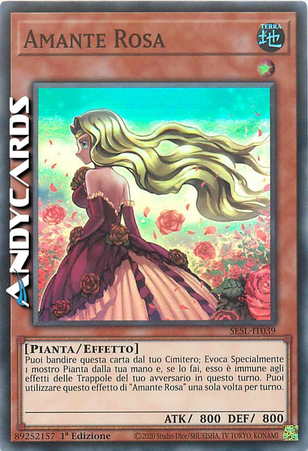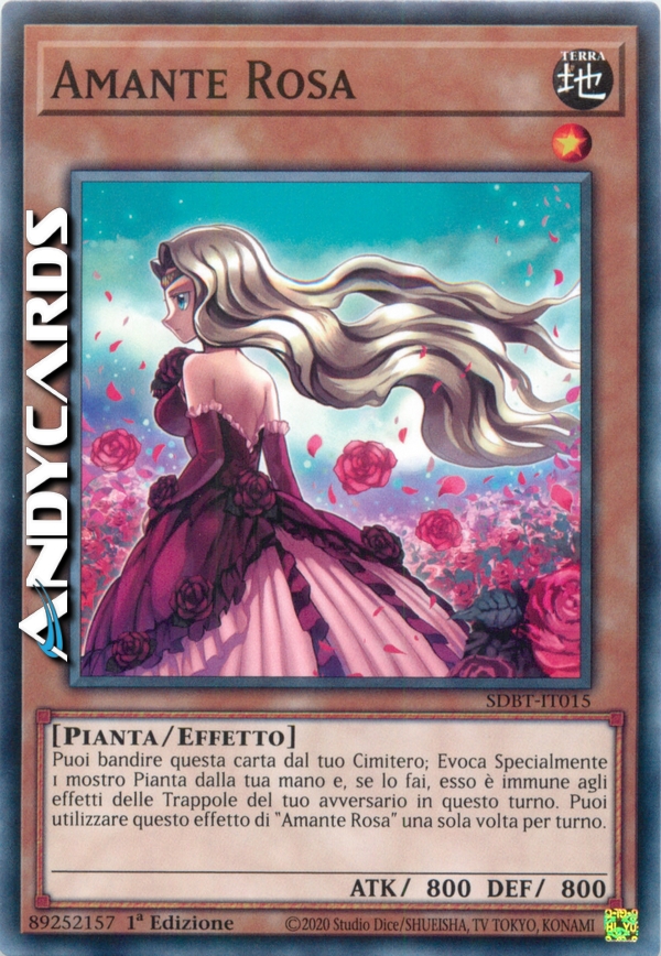 Puoi bandire questa carta dal tuo Cimitero; Evoca Specialmente 1 mostro Pianta dalla tua mano e, se lo fai, esso è immune agli effetti delle Trappole del tuo avversario in questo turno. Puoi utilizzare questo effetto di "Amante Rosa" una sola volta per turno.