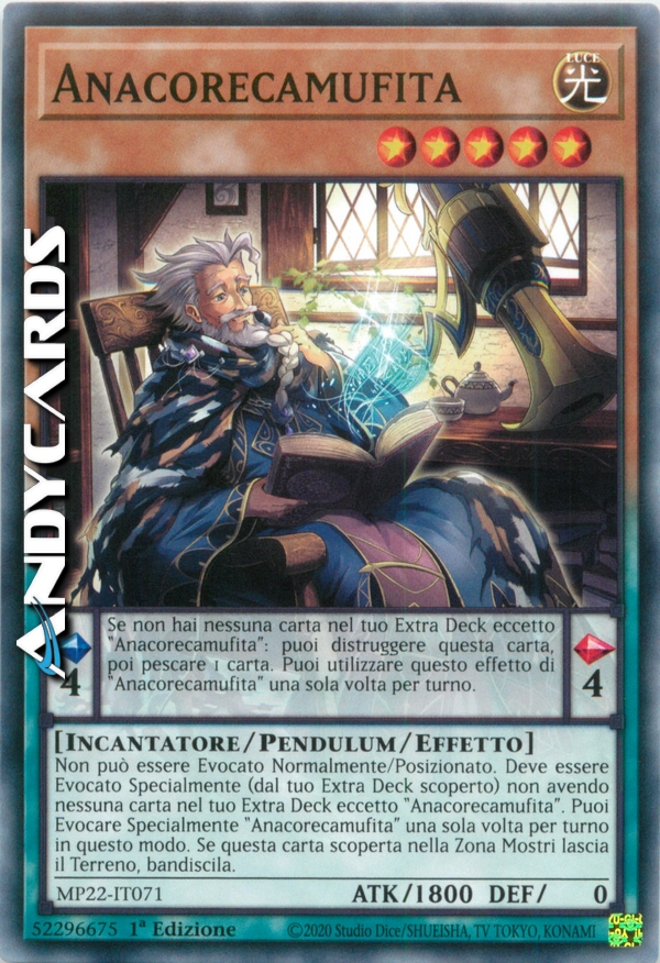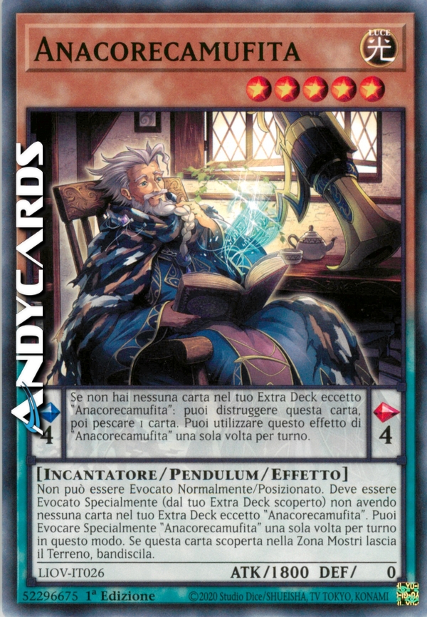 Effetto Pendulum: Se non hai nessuna carta nel tuo Extra Deck eccetto "Anacorecamufita": puoi distruggere questa carta, poi pescare 1 carta. Puoi utilizzare questo effetto di "Anacorecamufita" una sola volta per turno.