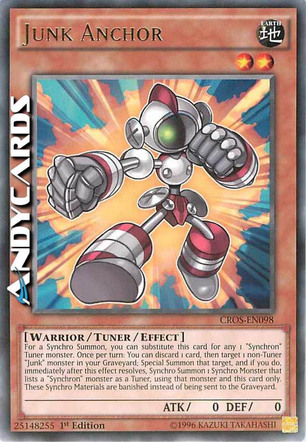 For a Synchro Summon, you can substitute this card for any 1 "Synchron" Tuner. Once per turn: You can discard 1 card, then target 1 non-Tuner "Junk" monster in your GY; Special Summon that target, and if you do, immediately after this effect resolves, Synchro Summon 1 Synchro Monster that mentions a "Synchron" Tuner as material, using that monster and this card only. These Synchro Materials are banished instead of being sent to the GY.