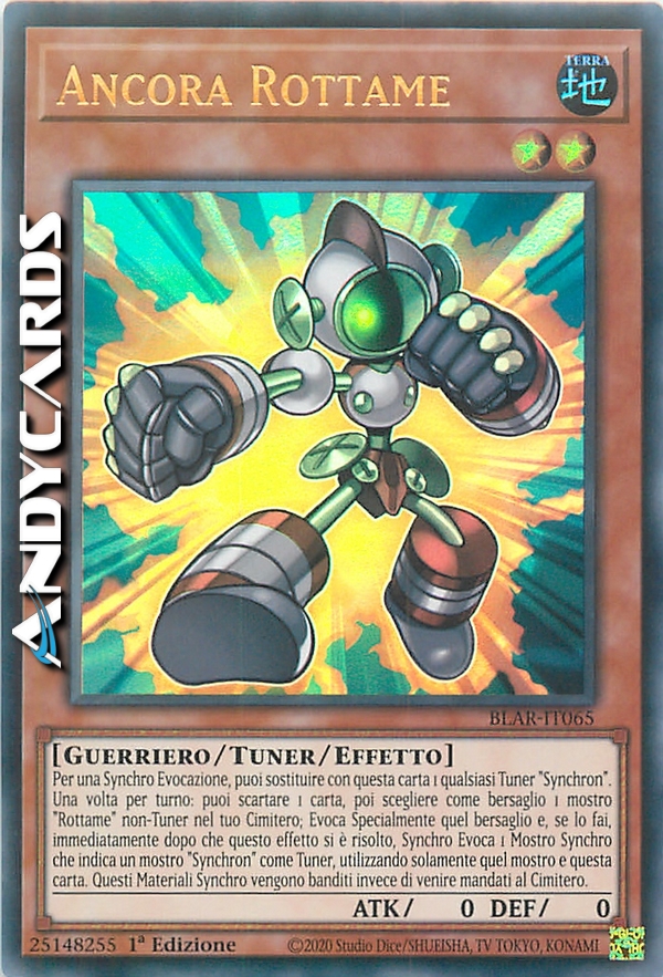 Per una Synchro Evocazione, puoi sostituire con questa carta 1 qualsiasi mostro Tuner "Synchron". Una volta per turno: puoi scartare 1 carta, poi scegliere come bersaglio 1 mostro "Rottame" non-Tuner nel tuo Cimitero; Evoca Specialmente quel bersaglio e, se lo fai, immediatamente dopo che questo effetto si è risolto, Synchro Evoca 1 Mostro Synchro che indica un mostro "Synchron" come Tuner, utilizzando solamente quel mostro e questa carta. Questi Materiali Synchro vengono banditi invece di venire mandati al Cimitero.