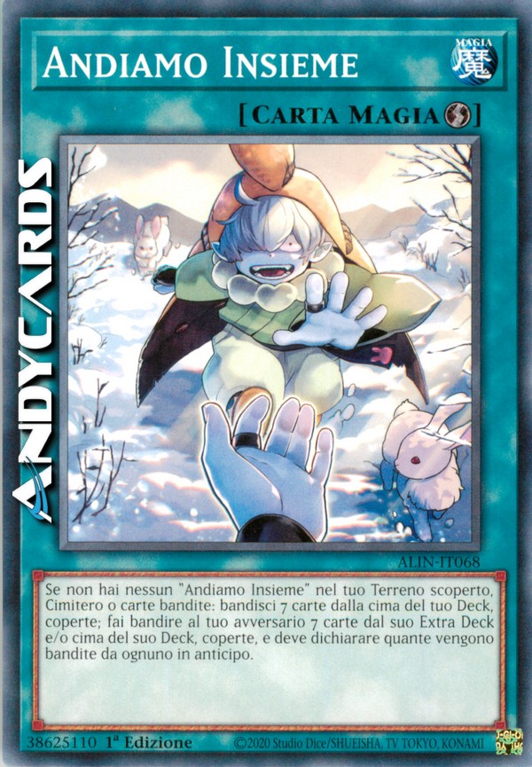 Se non hai nessun "Andiamo Insieme" nel tuo Terreno scoperto, Cimitero o carte bandite: bandisci 7 carte dalla cima del tuo Deck, coperte; fai bandire al tuo avversario 7 carte dal suo Extra Deck e/o cima del suo Deck, coperte, e deve dichiarare quante vengono bandite da ognuno in anticipo.