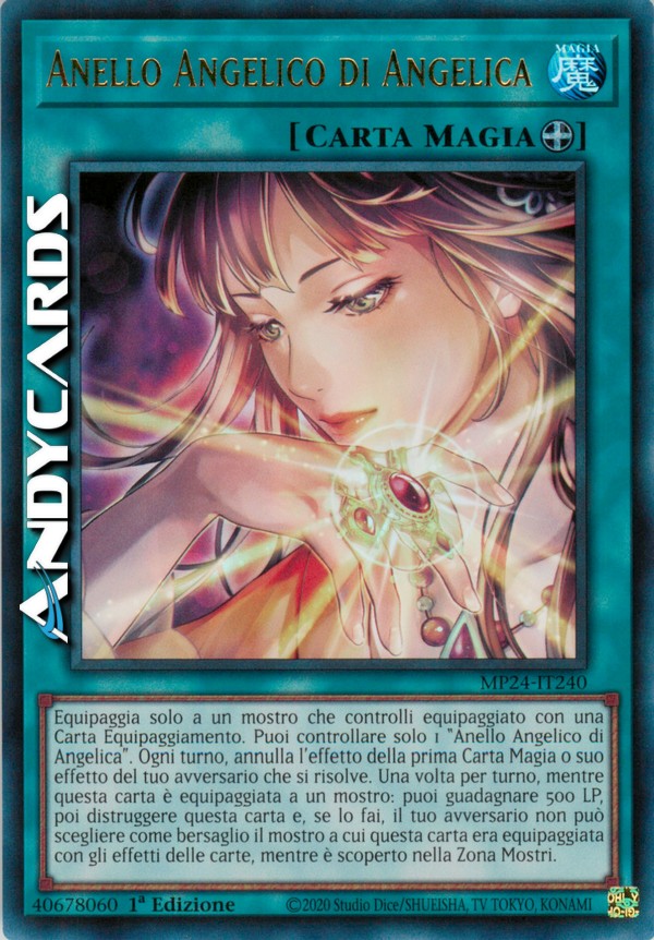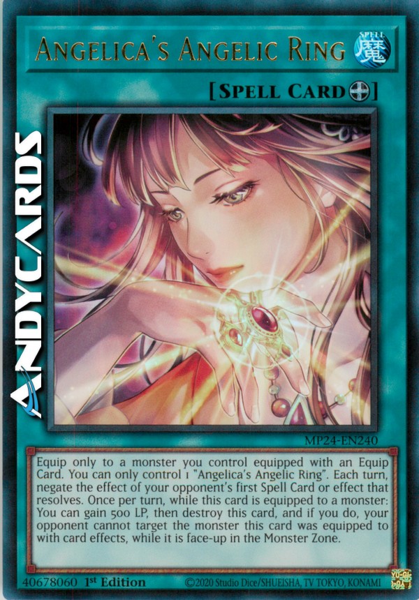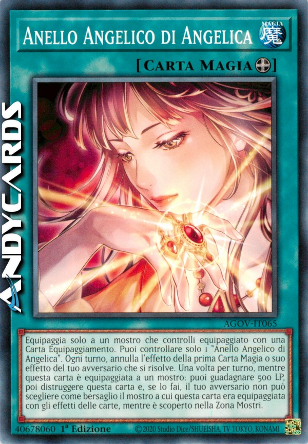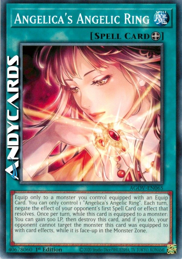 Equipaggia solo a un mostro che controlli equipaggiato con una Carta Equipaggiamento. Puoi controllare solo 1 "Anello Angelico di Angelica". Ogni turno, annulla l'effetto della prima Carta Magia o suo effetto del tuo avversario che si risolve. Una volta per turno, mentre questa carta è equipaggiata a un mostro: puoi guadagnare 500 LP, poi distruggere questa carta e, se lo fai, il tuo avversario non può scegliere come bersaglio il mostro a cui questa carta era equipaggiata con gli effetti delle carte, mentre è scoperto nella Zona Mostri.
