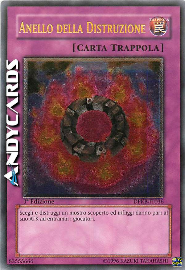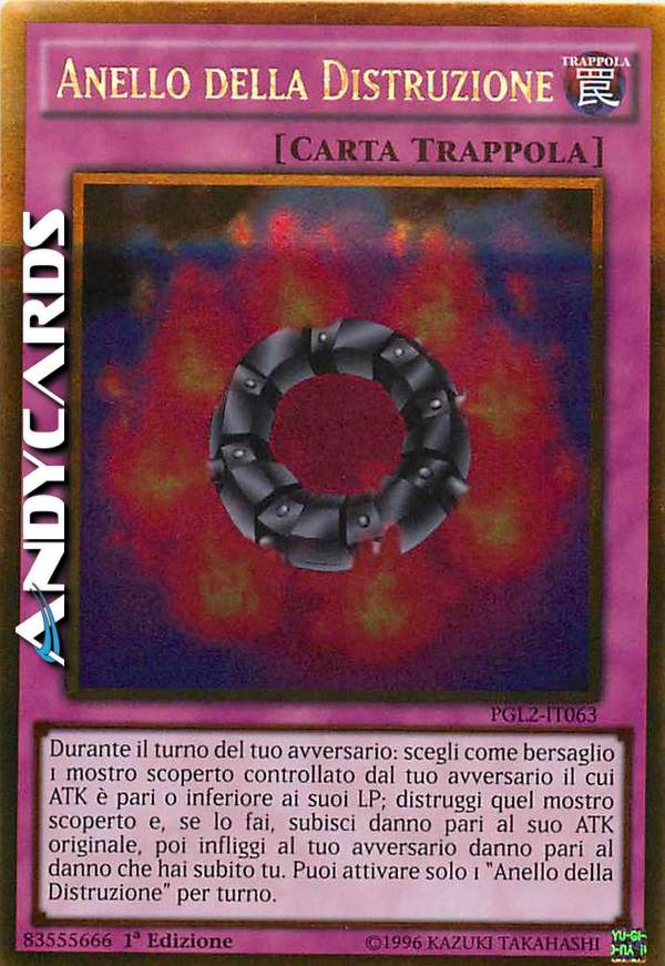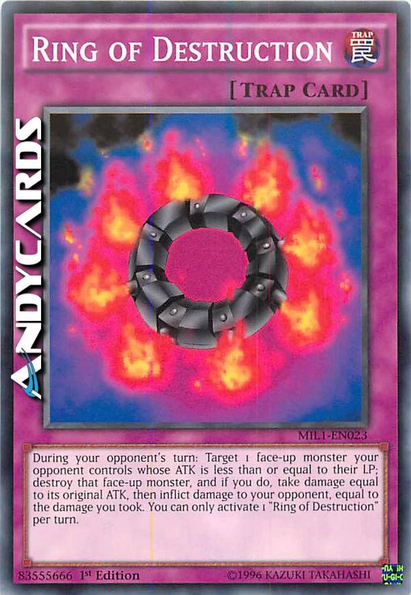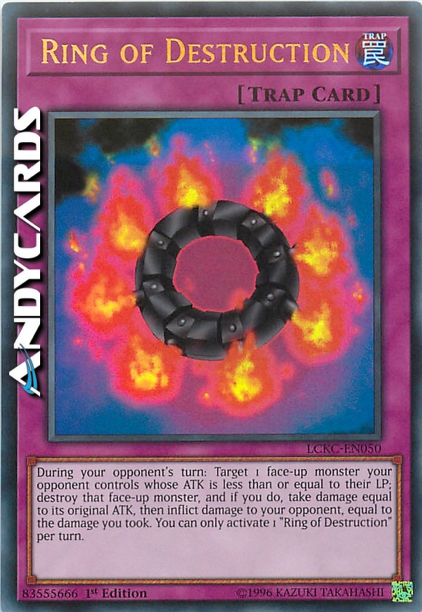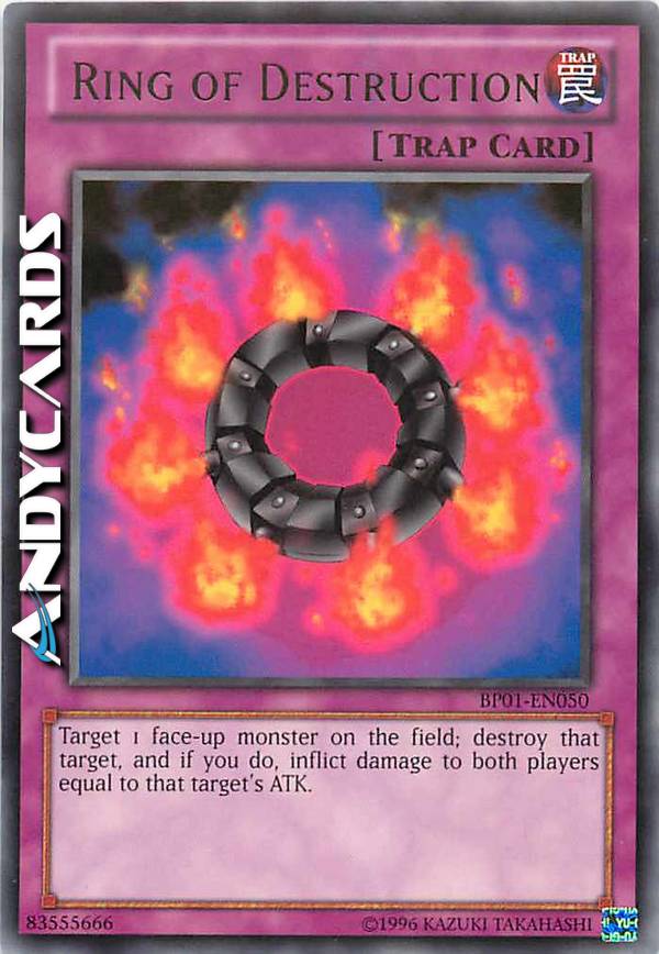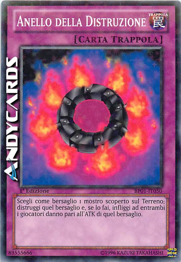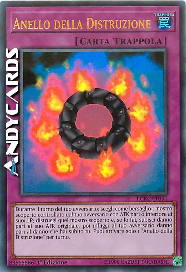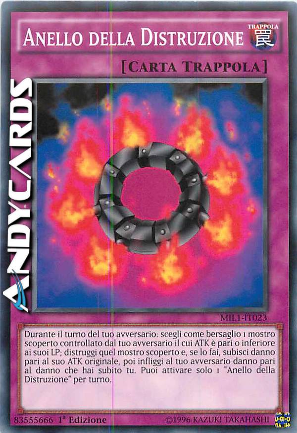 Durante il turno del tuo avversario: scegli come bersaglio 1 mostro scoperto controllato dal tuo avversario con ATK pari o inferiore ai suoi LP; distruggi quel mostro scoperto e, se lo fai, subisci danno pari al suo ATK originale, poi infliggi al tuo avversario danno pari al danno che hai subito tu. Puoi attivare solo 1 "Anello della Distruzione" per turno.