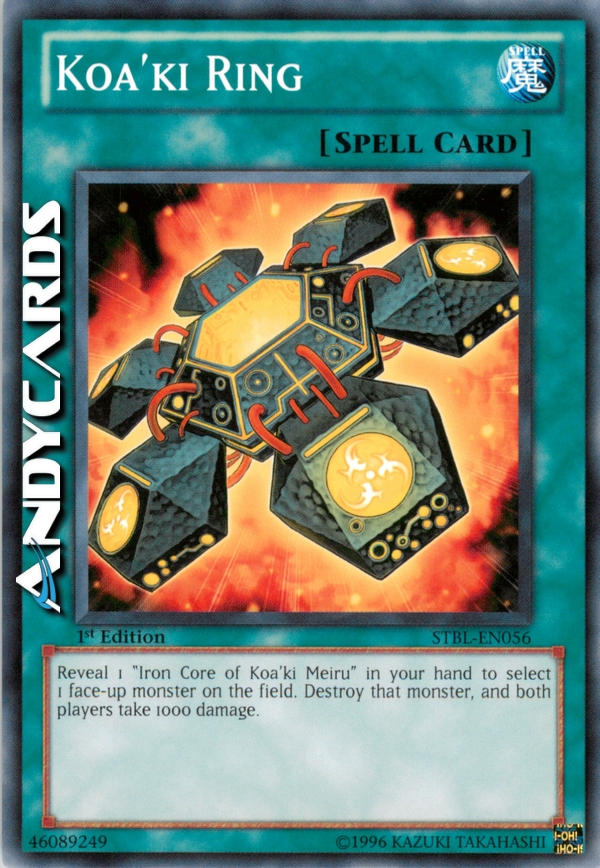 Rivela 1 "Nucleo di Ferro di Koa'ki Meiru" nella tua mano per scegliere 1 mostro scoperto sul Terreno. Distruggi quel mostro, ed entrambi i giocatori subiscono 1000 danni.
