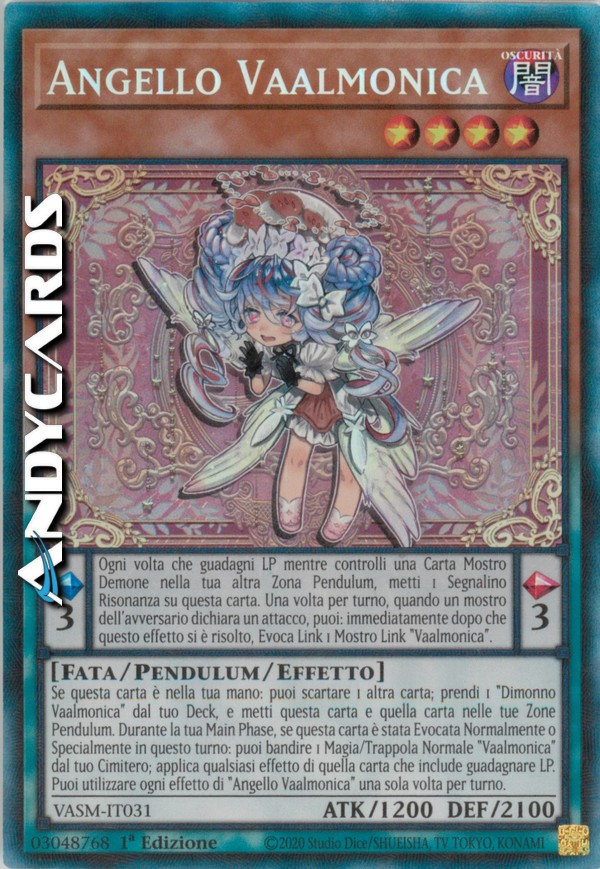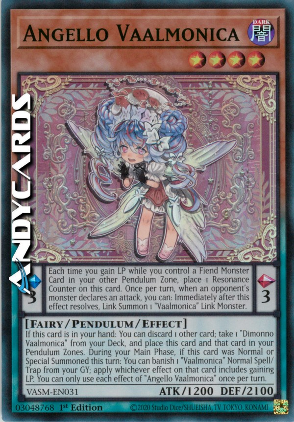 Se questa carta è nella tua mano: puoi scartare 1 altra carta; prendi 1 "Dimonno Vaalmonica" dal tuo Deck, e metti questa carta e quella carta nelle tue Zone Pendulum. Durante la tua Main Phase, se questa carta è stata Evocata Normalmente o Specialmente in questo turno: puoi bandire 1 Magia/Trappola Normale "Vaalmonica" dal tuo Cimitero; applica qualsiasi effetto di quella carta che include guadagnare LP. Puoi utilizzare ogni effetto di "Angello Vaalmonica" una sola volta per turno.