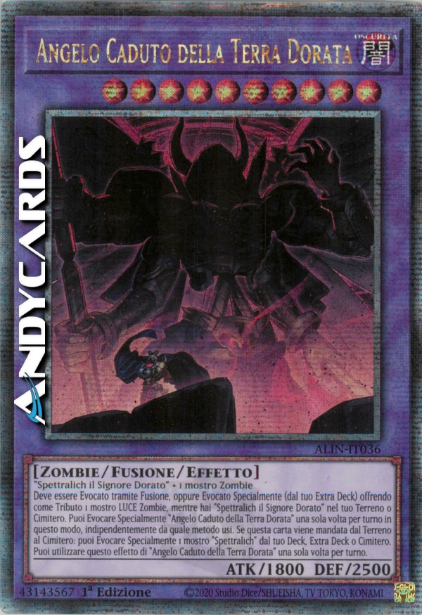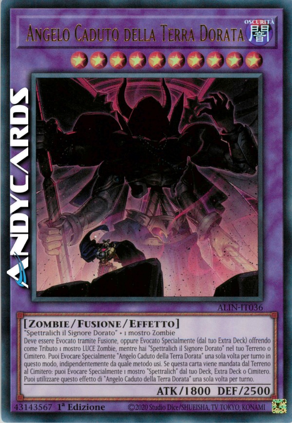 Deve essere Evocato tramite Fusione, oppure Evocato Specialmente (dal tuo Extra Deck) offrendo come Tributo 1 mostro LUCE Zombie, mentre hai "Spettralich il Signore Dorato" nel tuo Terreno o Cimitero. Puoi Evocare Specialmente "Angelo Caduto della Terra Dorata" una sola volta per turno in questo modo, indipendentemente da quale metodo usi. Se questa carta viene mandata dal Terreno al Cimitero: puoi Evocare Specialmente 1 mostro "Spettralich" dal tuo Deck, Extra Deck o Cimitero. Puoi utilizzare questo effetto di "Angelo Caduto della Terra Dorata" una sola volta per turno.