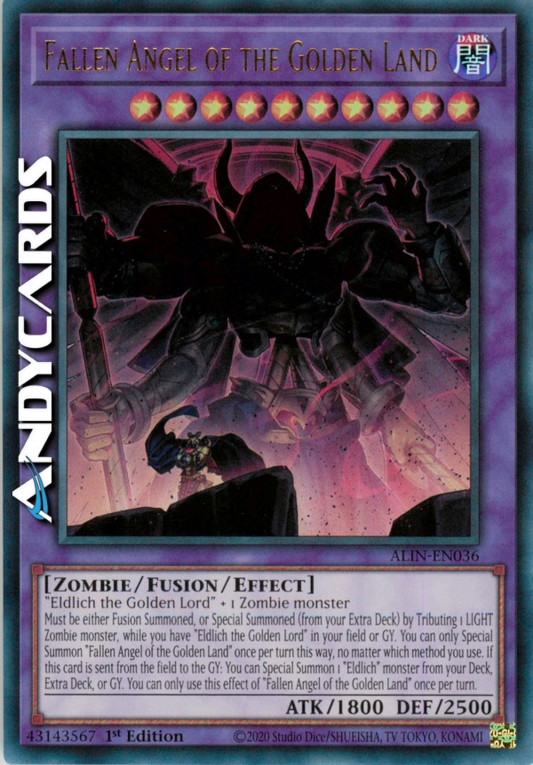 Must be either Fusion Summoned, or Special Summoned (from your Extra Deck) by Tributing 1 LIGHT Zombie monster, while you have "Eldlich the Golden Lord" in your field or GY. You can only Special Summon "Fallen Angel of the Golden Land" once per turn this way, no matter which method you use. If this card is sent from the field to the GY: You can Special Summon 1 "Eldlich" monster from your Deck, Extra Deck, or GY. You can only use this effect of "Fallen Angel of the Golden Land" once per turn.