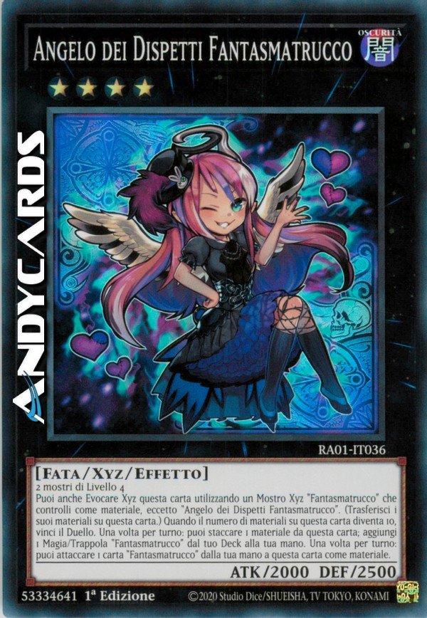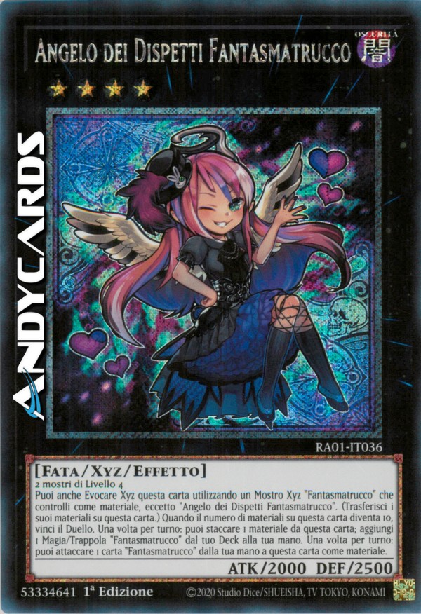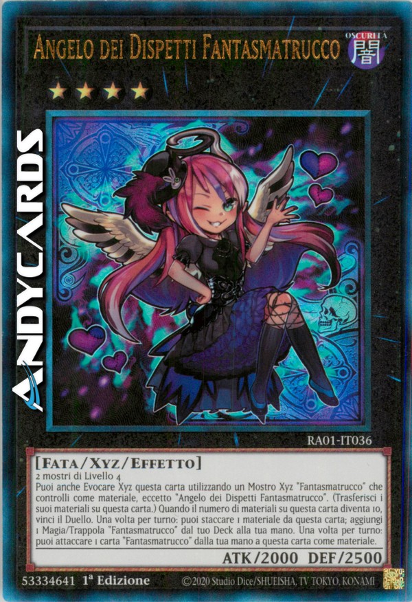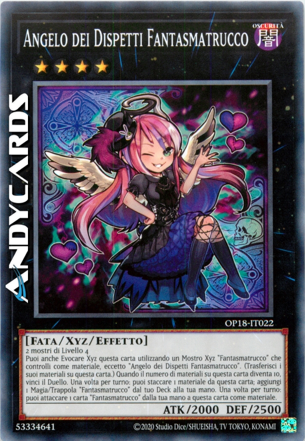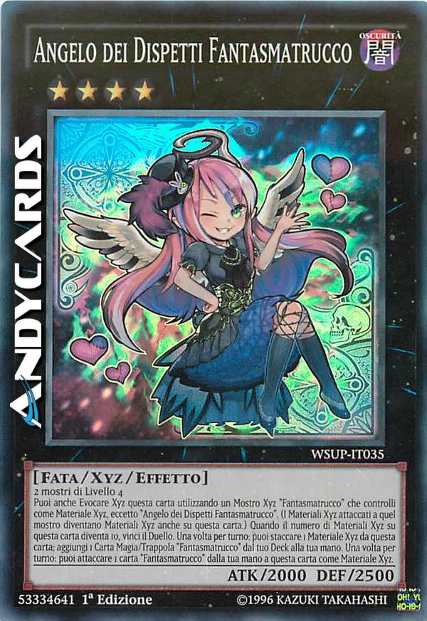 Puoi anche Evocare Xyz questa carta utilizzando un Mostro Xyz "Fantasmatrucco" che controlli come materiale, eccetto "Angelo dei Dispetti Fantasmatrucco". (Trasferisci i suoi materiali su questa carta.) Quando il numero di materiali su questa carta diventa 10, vinci il Duello. Una volta per turno: puoi staccare 1 materiale da questa carta; aggiungi 1 Magia/Trappola "Fantasmatrucco" dal tuo Deck alla tua mano. Una volta per turno: puoi attaccare 1 carta "Fantasmatrucco" dalla tua mano a questa carta come materiale.