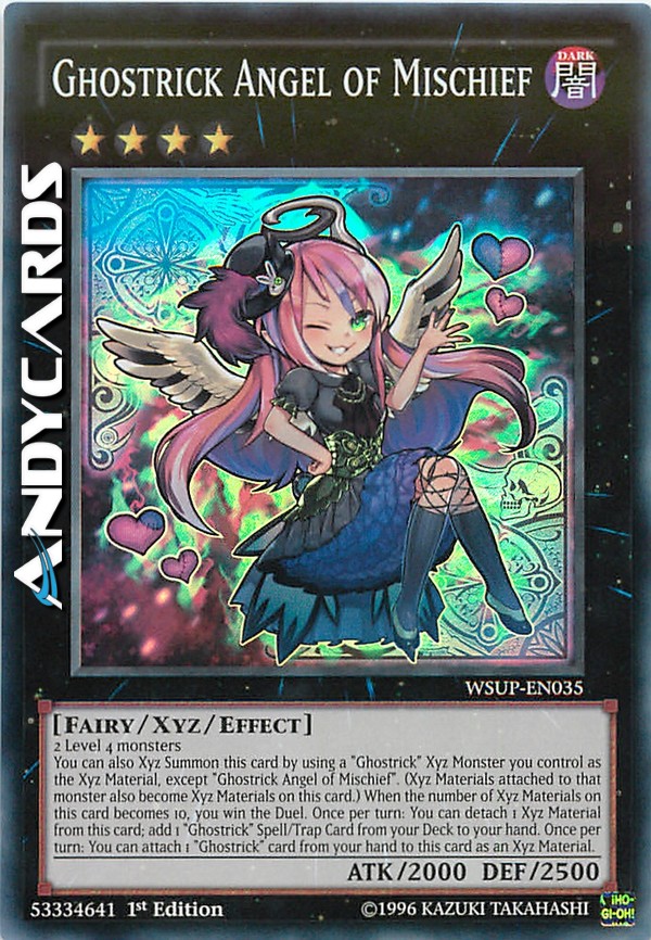 You can also Xyz Summon this card by using a "Ghostrick" Xyz Monster you control as material, except "Ghostrick Angel of Mischief". (Transfer its materials to this card.) When the number of materials on this card becomes 10, you win the Duel. Once per turn: You can detach 1 material from this card; add 1 "Ghostrick" Spell/Trap from your Deck to your hand. Once per turn: You can attach 1 "Ghostrick" card from your hand to this card as material.