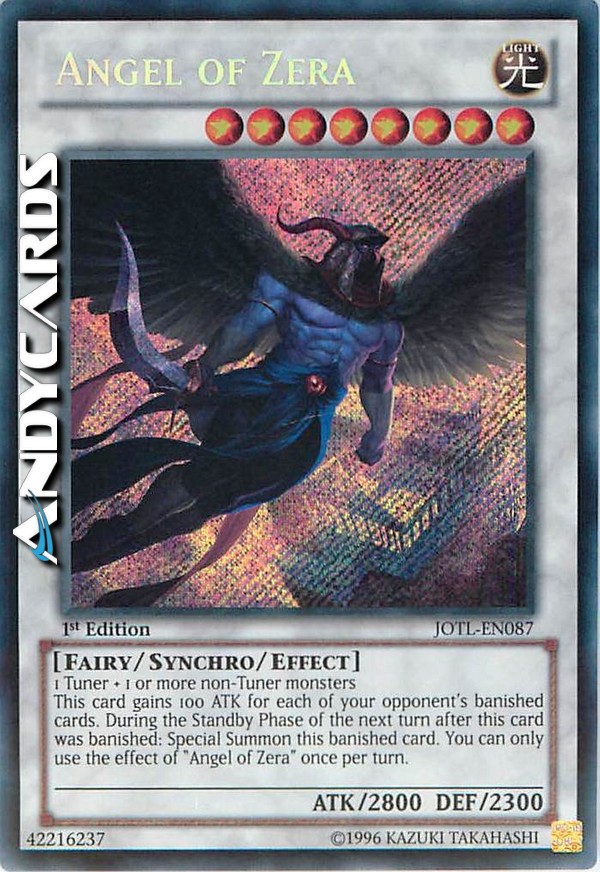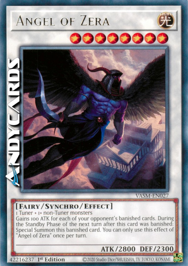 Questa carta guadagna 100 ATK per ognuna delle carte bandite del tuo avversario. Durante la Standby Phase del prossimo turno dopo che questa carta è stata bandita: Evoca Specialmente questa carta bandita. Puoi utilizzare l'effetto di "Angelo di Zera" una sola volta per turno.
