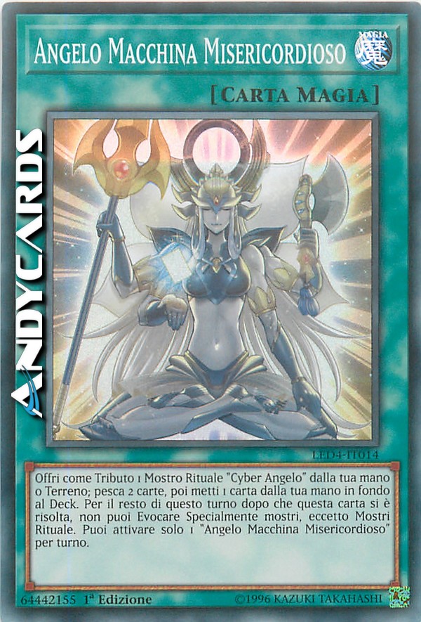 Offri come Tributo 1 Mostro Rituale "Cyber Angelo" dalla tua mano o Terreno; pesca 2 carte, poi metti 1 carta dalla tua mano in fondo al Deck. Per il resto di questo turno dopo che questa carta si è risolta, non puoi Evocare Specialmente mostri, eccetto Mostri Rituale. Puoi attivare solo 1 "Angelo Macchina Misericordioso" per turno.