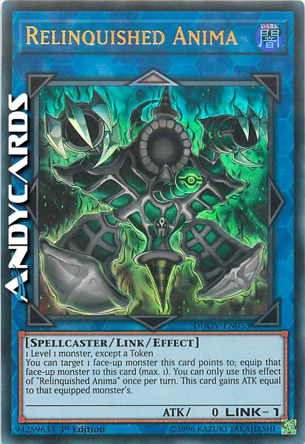 You can target 1 face-up monster this card points to; equip that face-up monster to this card (max. 1). You can only use this effect of "Relinquished Anima" once per turn. This card gains ATK equal to that equipped monster's.