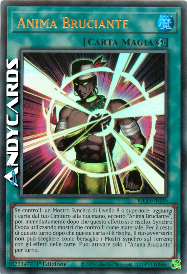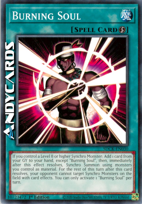Se controlli un Mostro Synchro di Livello 8 o superiore: aggiungi 1 carta dal tuo Cimitero alla tua mano, eccetto "Anima Bruciante", poi, immediatamente dopo che questo effetto si è risolto, Synchro Evoca utilizzando mostri che controlli come materiale. Per il resto di questo turno dopo che questa carta si è risolta, il tuo avversario non può scegliere come bersaglio i Mostri Synchro sul Terreno con gli effetti delle carte. Puoi attivare solo 1 "Anima Bruciante" per turno.