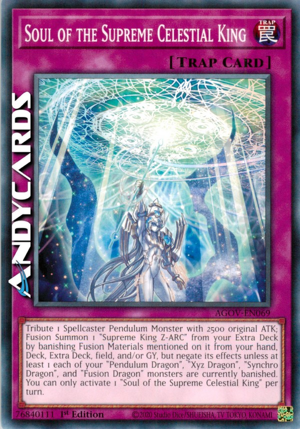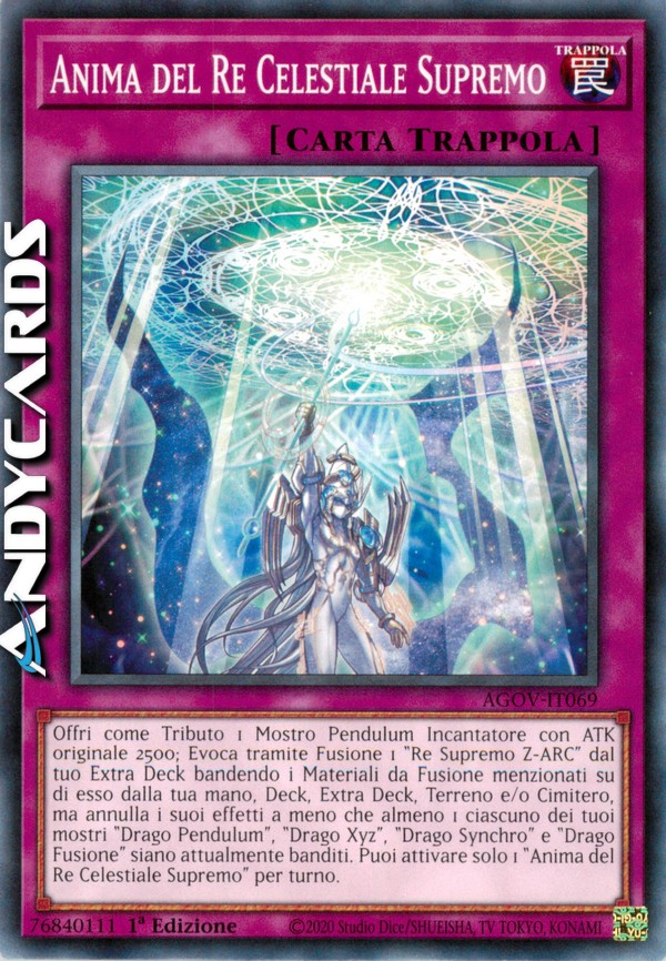 Offri come Tributo 1 Mostro Pendulum Incantatore con ATK originale 2500; Evoca tramite Fusione 1 "Re Supremo Z-ARC" dal tuo Extra Deck bandendo i Materiali da Fusione menzionati su di esso dalla tua mano, Deck, Extra Deck, Terreno e/o Cimitero, ma annulla i suoi effetti a meno che almeno 1 ciascuno dei tuoi mostri "Drago Pendulum", "Drago Xyz", "Drago Synchro" e "Drago Fusione" siano attualmente banditi. Puoi attivare solo 1 "Anima del Re Celestiale Supremo" per turno.