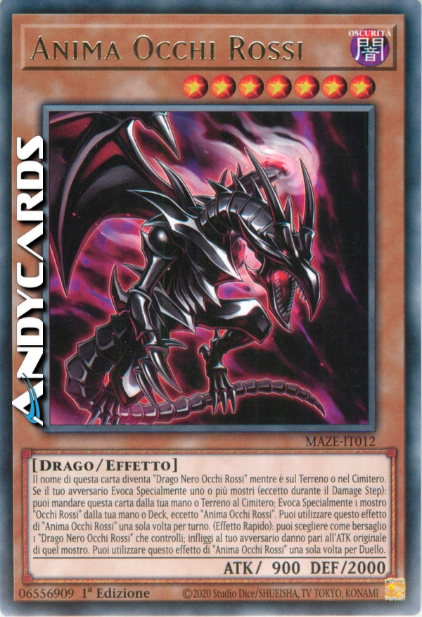 Il nome di questa carta diventa "Drago Nero Occhi Rossi" mentre è sul Terreno o nel Cimitero. Se il tuo avversario Evoca Specialmente uno o più mostri (eccetto durante il Damage Step): puoi mandare questa carta dalla tua mano o Terreno al Cimitero; Evoca Specialmente 1 mostro "Occhi Rossi" dalla tua mano o Deck, eccetto "Anima Occhi Rossi". Puoi utilizzare questo effetto di "Anima Occhi Rossi" una sola volta per turno. (Effetto Rapido): puoi scegliere come bersaglio 1 "Drago Nero Occhi Rossi" che controlli; infliggi al tuo avversario danno pari all'ATK originale di quel mostro. Puoi utilizzare questo effetto di "Anima Occhi Rossi" una sola volta per Duello.