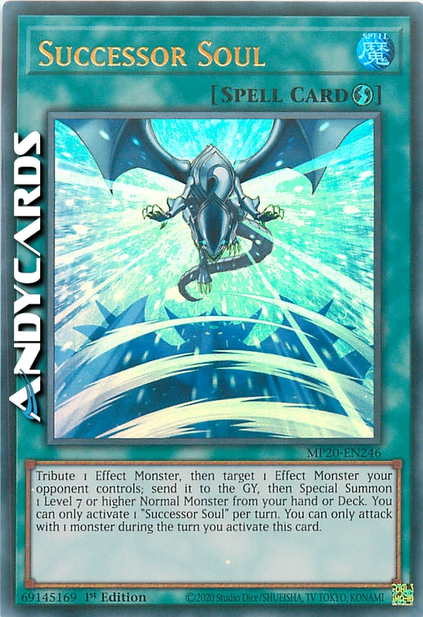 Offri come Tributo 1 Mostro con Effetto, poi scegli come bersaglio 1 Mostro con Effetto controllato dal tuo avversario; mandalo al Cimitero, poi Evoca Specialmente 1 Mostro Normale di Livello 7 o superiore dalla tua mano o Deck. Puoi attivare solo 1 "Anima Succeditrice" per turno. Puoi attaccare solo con 1 mostro durante il turno in cui attivi questa carta.