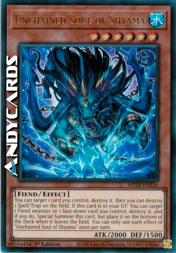 You can target 1 card you control; destroy it, then you can destroy 1 Spell/Trap on the field. If this card is in your GY: You can target 1 Fiend monster or 1 face-down card you control; destroy it, and if you do, Special Summon this card, but place it on the bottom of the Deck when it leaves the field. You can only use each effect of "Unchained Soul of Shyama" once per turn.