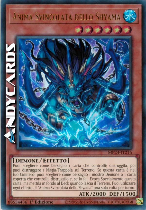 Puoi scegliere come bersaglio 1 carta che controlli; distruggila, poi puoi distruggere 1 Magia/Trappola sul Terreno. Se questa carta è nel tuo Cimitero: puoi scegliere come bersaglio 1 mostro Demone o 1 carta coperta che controlli; distruggilo e, se lo fai, Evoca Specialmente questa carta, ma mettila in fondo al Deck quando lascia il Terreno. Puoi utilizzare ogni effetto di "Anima Svincolata dello Shyama" una sola volta per turno.