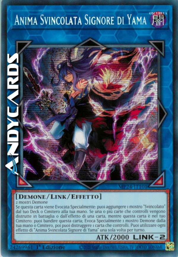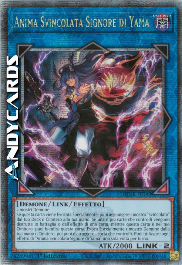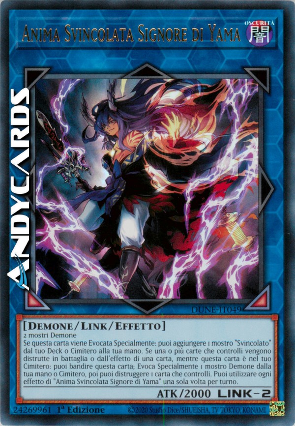 Se questa carta viene Evocata Specialmente: puoi aggiungere 1 mostro "Svincolato" dal tuo Deck o Cimitero alla tua mano. Se una o più carte che controlli vengono distrutte in battaglia o dall'effetto di una carta, mentre questa carta è nel tuo Cimitero: puoi bandire questa carta; Evoca Specialmente 1 mostro Demone dalla tua mano o Cimitero, poi puoi distruggere 1 carta che controlli. Puoi utilizzare ogni effetto di "Anima Svincolata Signore di Yama" una sola volta per turno.