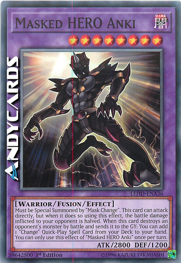Must be Special Summoned with "Mask Change" and cannot be Special Summoned by other ways. This card can attack your opponent directly, but when it does so using this effect, the battle damage inflicted to your opponent is halved. When this card destroys an opponent's monster by battle and sends it to the Graveyard: You can add 1 "Change" Quick-Play Spell Card from your Deck to your hand. You can only use this effect of "Masked HERO Anki" once per turn.