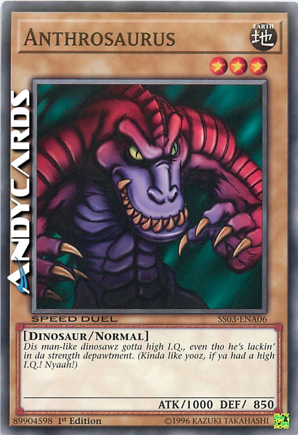 Dis man-like dinosawz gotta high I.Q., even tho he's lackin' in da strength depawtment. (Kinda like yooz, if ya had a high I.Q.! Nyaah!)